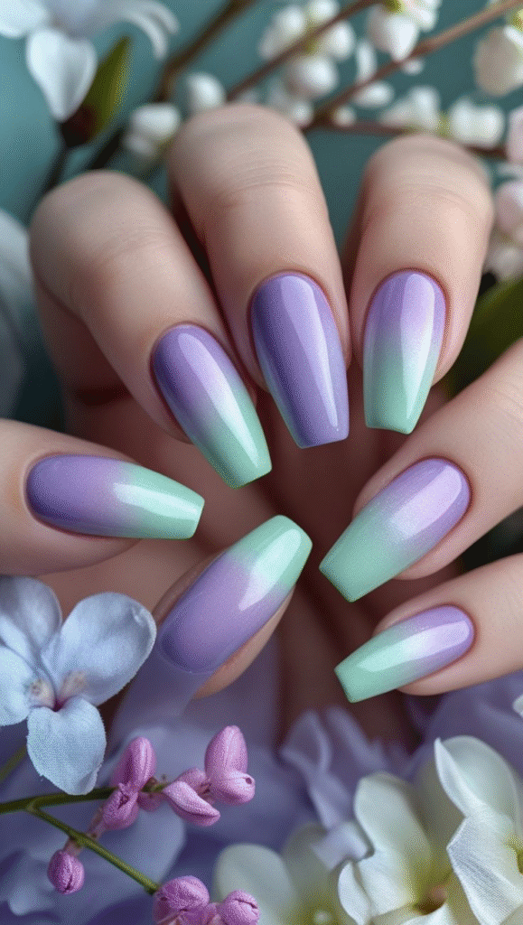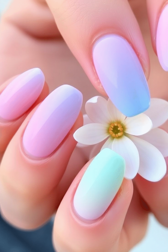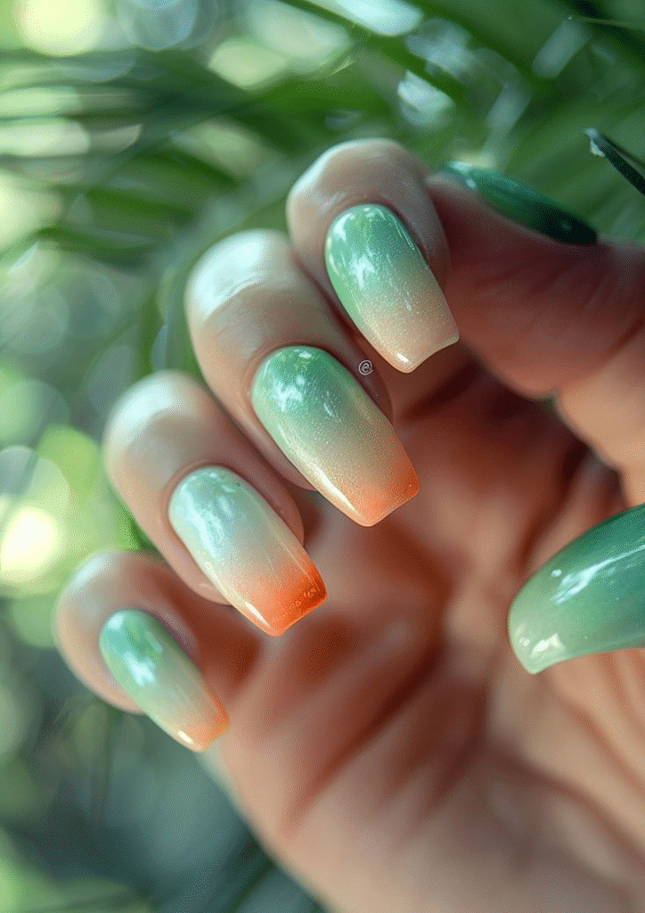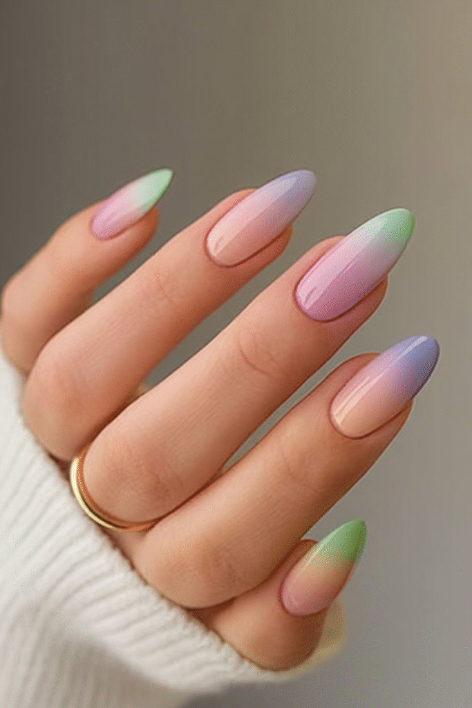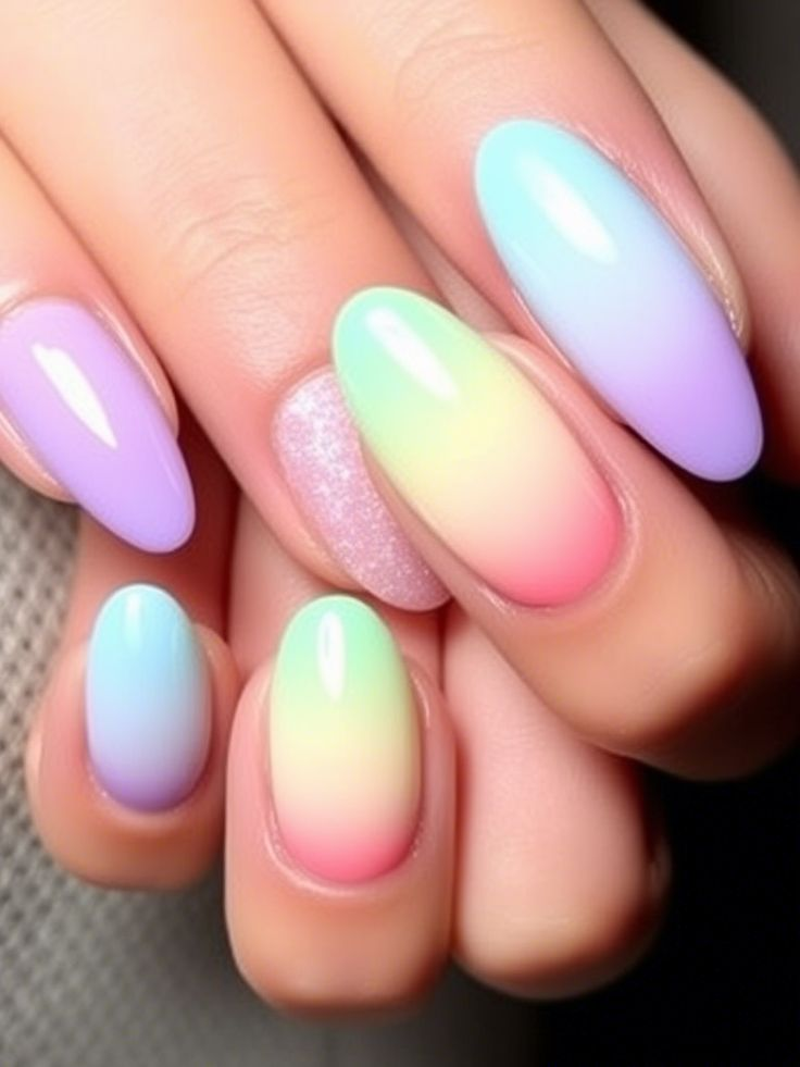 A soft blend of pink, green, and yellow with a glossy finish creates a watercolor-inspired ombre that feels both artistic and rejuvenating.