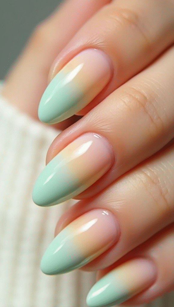 - Use a makeup sponge to softly blend pastel pink with mint green, creating a flawless ombre transition.
