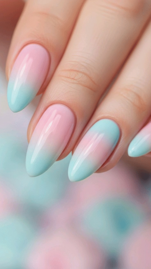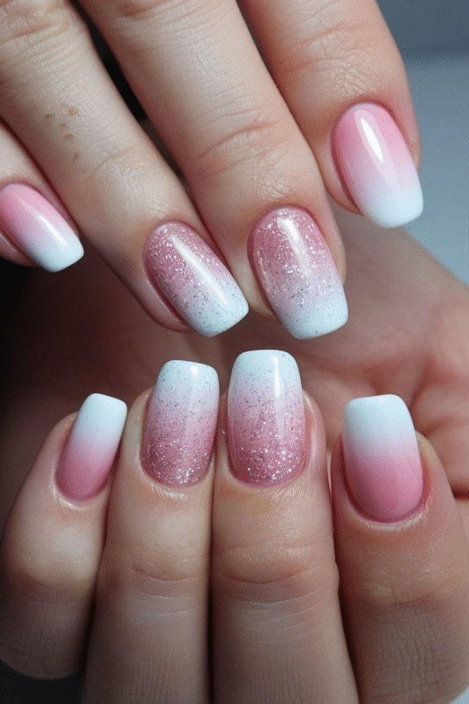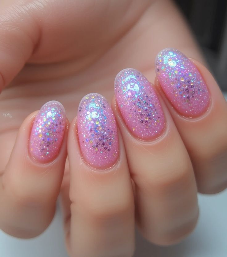 A soft blend of pink fading into mint green, topped with a touch of glitter, creates a whimsical cotton candy ombre effect—ideal for anyone who adores nails that are both playful and chic.